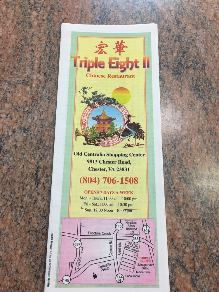 Welcome to Triple Eight 2, where authentic Chinese flavors meet delightful hospitality. Located in Chester, VA, this charming eatery boasts a diverse menu perfect for family outings or quick takeout. Whether you're savoring the General Tso's Chicken or indulging in crab rangoon, each dish is crafted to satisfy cravings.